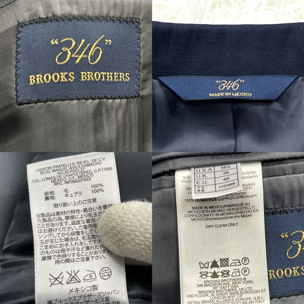 しかし、1990年代以降、この「346」はアウトレット専売ラインの名称へと移行しました。ここでの最大の判別ポイントは「ロゴのフォント」です。メインラインが伝統的な流れるような「筆記体」なのに対し、346のアウトレット品はすべて大文字の角ばった「ブロック体」で記載される傾向があります。また、シャツのサイズ表記にも決定的な違いがありますよ。メインラインが「33」のように1インチ刻みの正確な袖丈なのに対し、346は「32/33」といった兼用のスプリット表記になっています。当時の最高級品を探しているなら、このフォントとサイズ表記の違いは絶対に見落とせません。(出典:Wikipedia『Brooks Brothers』)